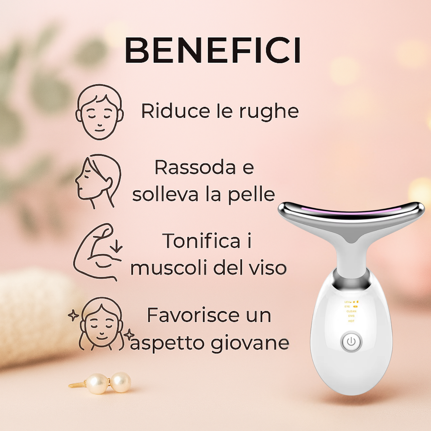 Riduci rughe e rilassamento cutaneo con un effetto lift immediato e naturale. La stimolazione EMS riattiva la microcircolazione, tonifica i tessuti in profondità e valorizza la tua routine di bellezza quotidiana.